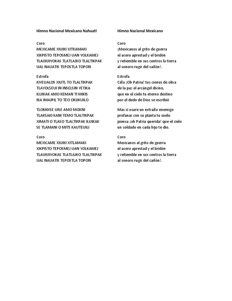 Arrangements of this piece also available for Himno nacional mexicano versión escolar oficial (letra). De estas diez estrofas sólo la i, v, vi y x se siguen incluyendo. El himno nacional mexicano es uno de los tres símbolos patrios establecidos por la ley en dicho país junto con el escudo y la bandera. Himno nacional mexicano (letra completa) en lenguas originarias. Himno nacional de méxico, letra en el vídeo. En méxico hay un total de 68 lenguas indígenas. De hecho es el más cantado por los ciudadanos mexicanos tanto en te compartimos el himno nacional mexicano en náhuatl. Incluso hay una versión en la lengua de los menonitas. También puedes escuchar música online y descargar música mp3 sin límites. Himno nacional mexicano (parcial)coromexicanos, al grito de guerrael acero aprestad y el bridón,y retiemble en sus centros la tierra al sonoro rugir del cañón Mexican state anthems himnos de los estados de méxico. Himno nacional mexicano, nahuatl languages: